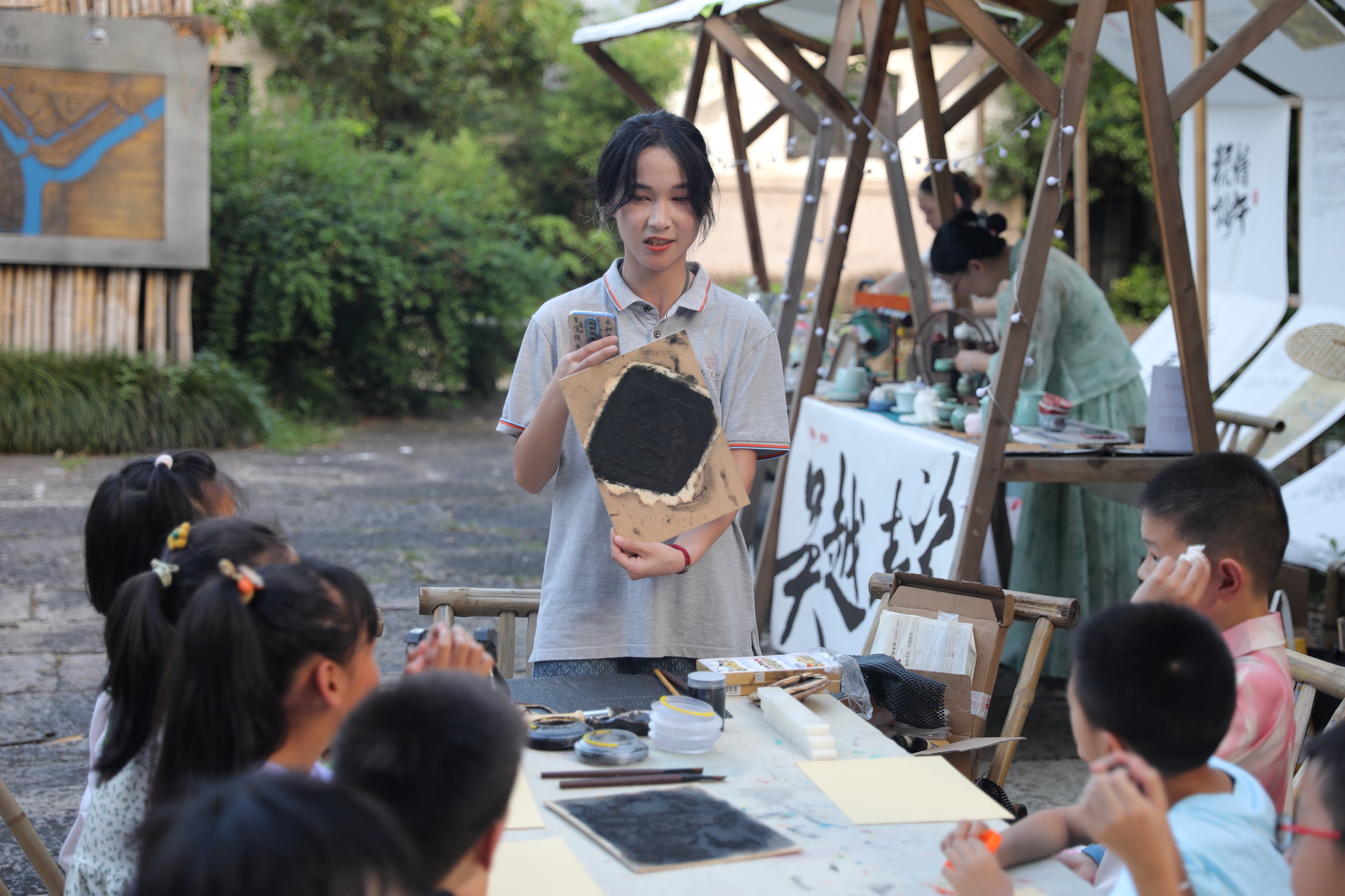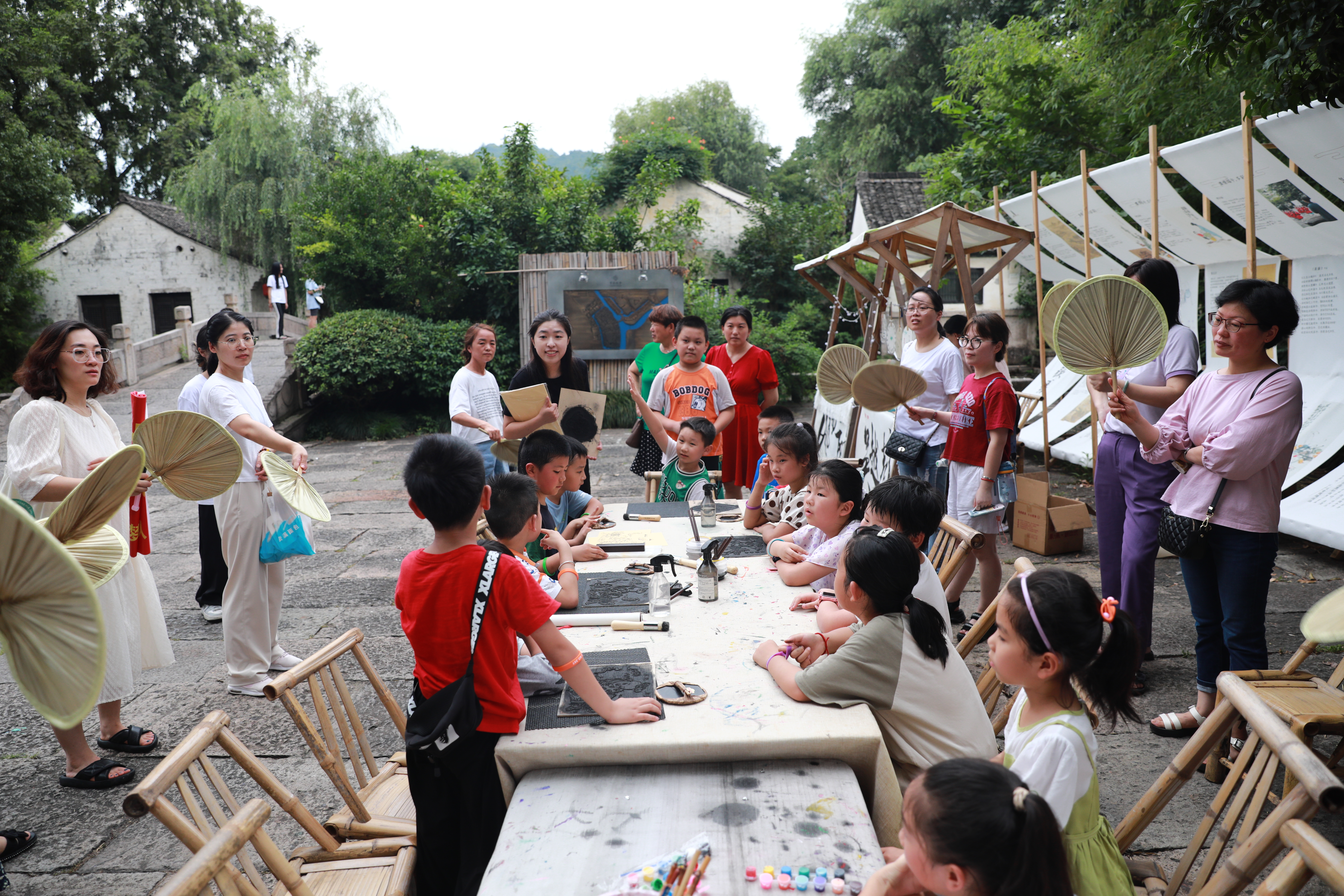 清凉扇市、越窑青瓷、手工勾线、水印木刻、书法绘画、竹山编织……近日,一项项非遗文化展示互动体验活动在开元旅业集团绍兴大禹开元观堂火热开展。本次活动以“品江南风物,听醉里吴音”为主题,融合了非遗技艺、特色文创、IP产品、国潮好物等内容,结合互动体验,打造了一场具有东方宋韵的国风市集。浙江艺术职业学院手工艺学院“守艺工坊”暑期社会实践团队充分利用专业优势,将所学非遗文化传统知识和技艺在绍兴大禹开元观堂古韵古香的古街宣传展示,助力非遗保护传承。