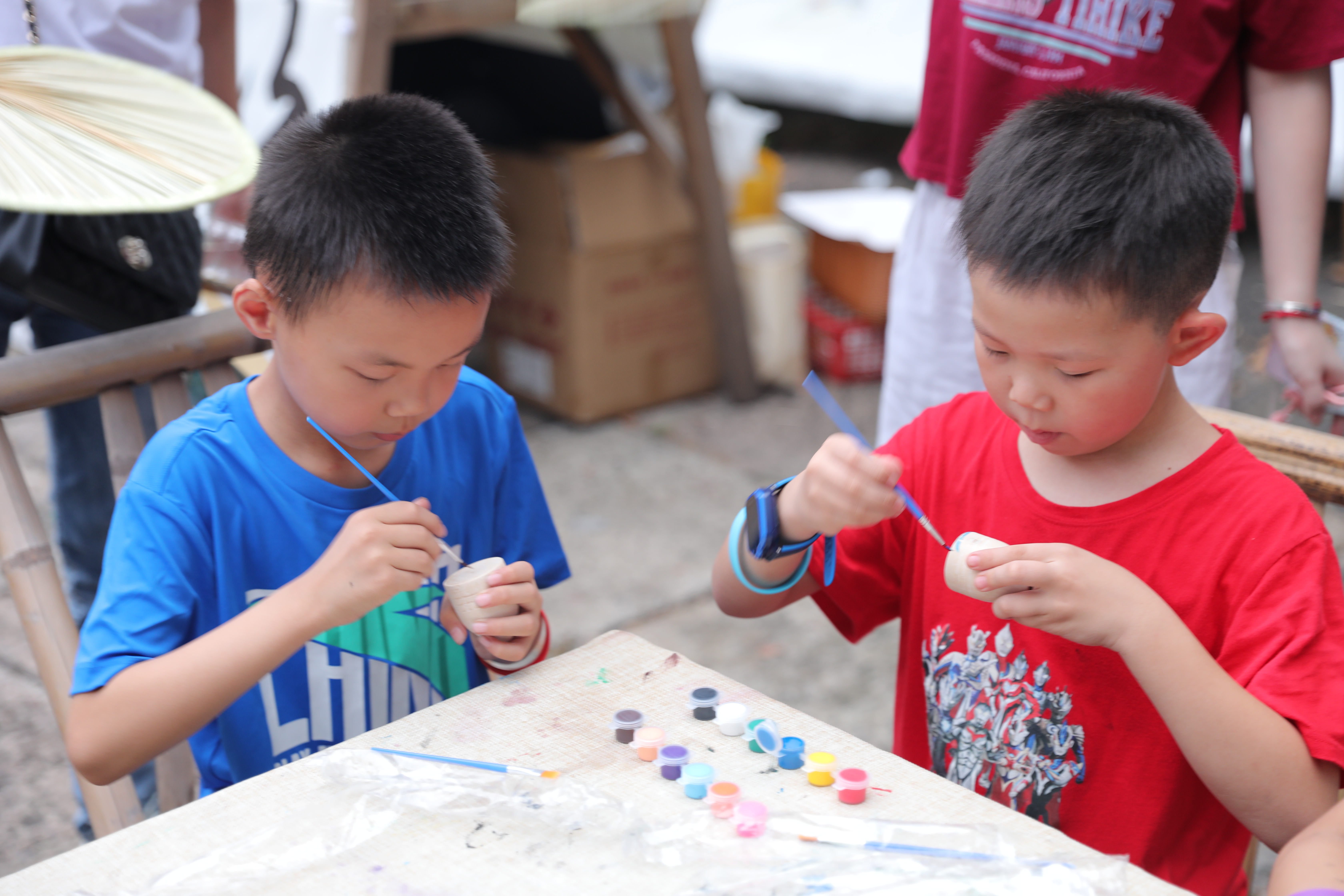 童心巧绘精彩。游客们充分发挥想象力和动手能力,巧手点缀扇面、陀螺,将其幻化为独一无二的作品。