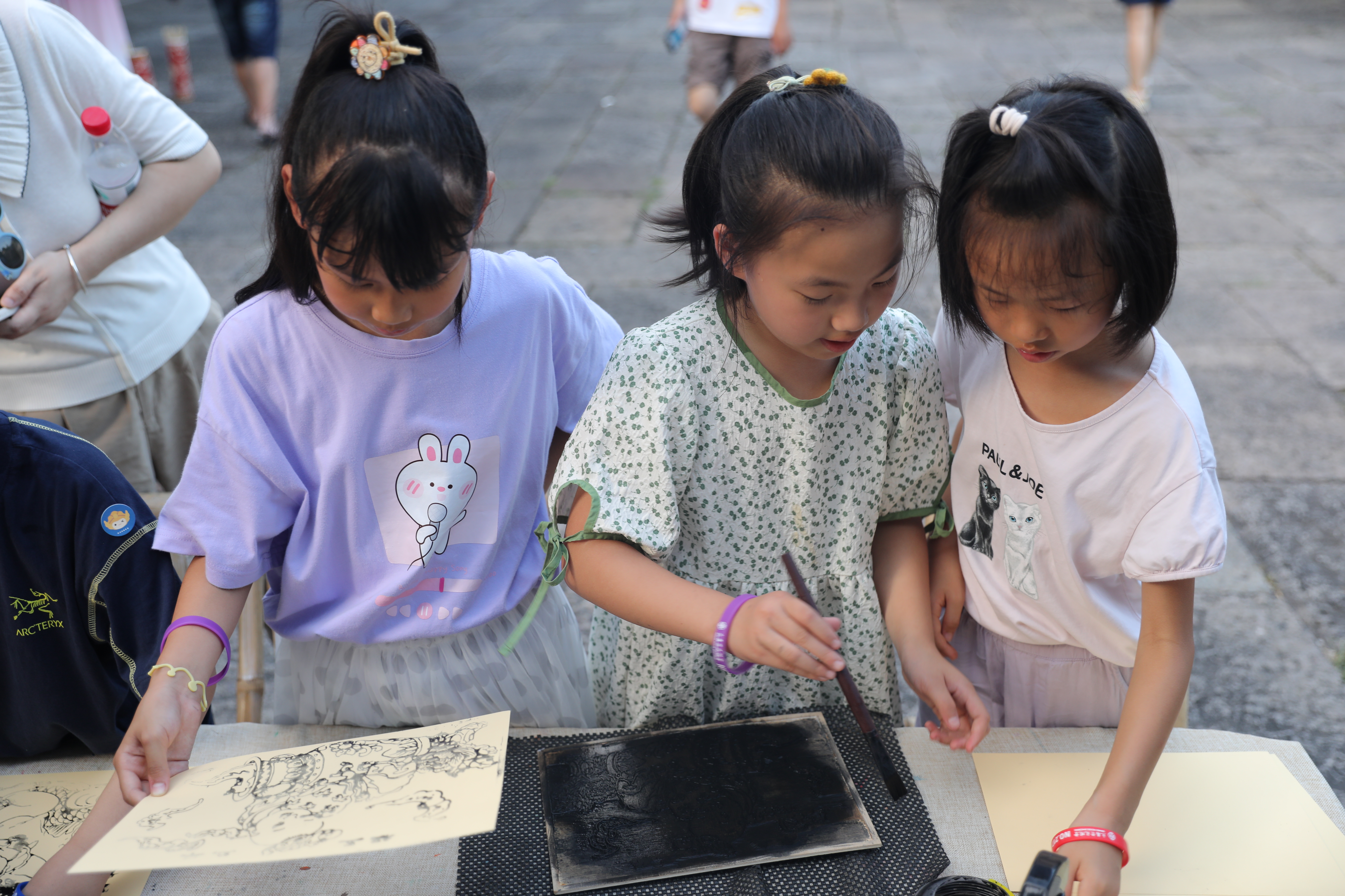 在手作体验区,水印木刻、投壶等项目吸引了许多亲子家庭的积极参与,在玩耍互动中,非遗寻知体验让孩子们印象深刻。