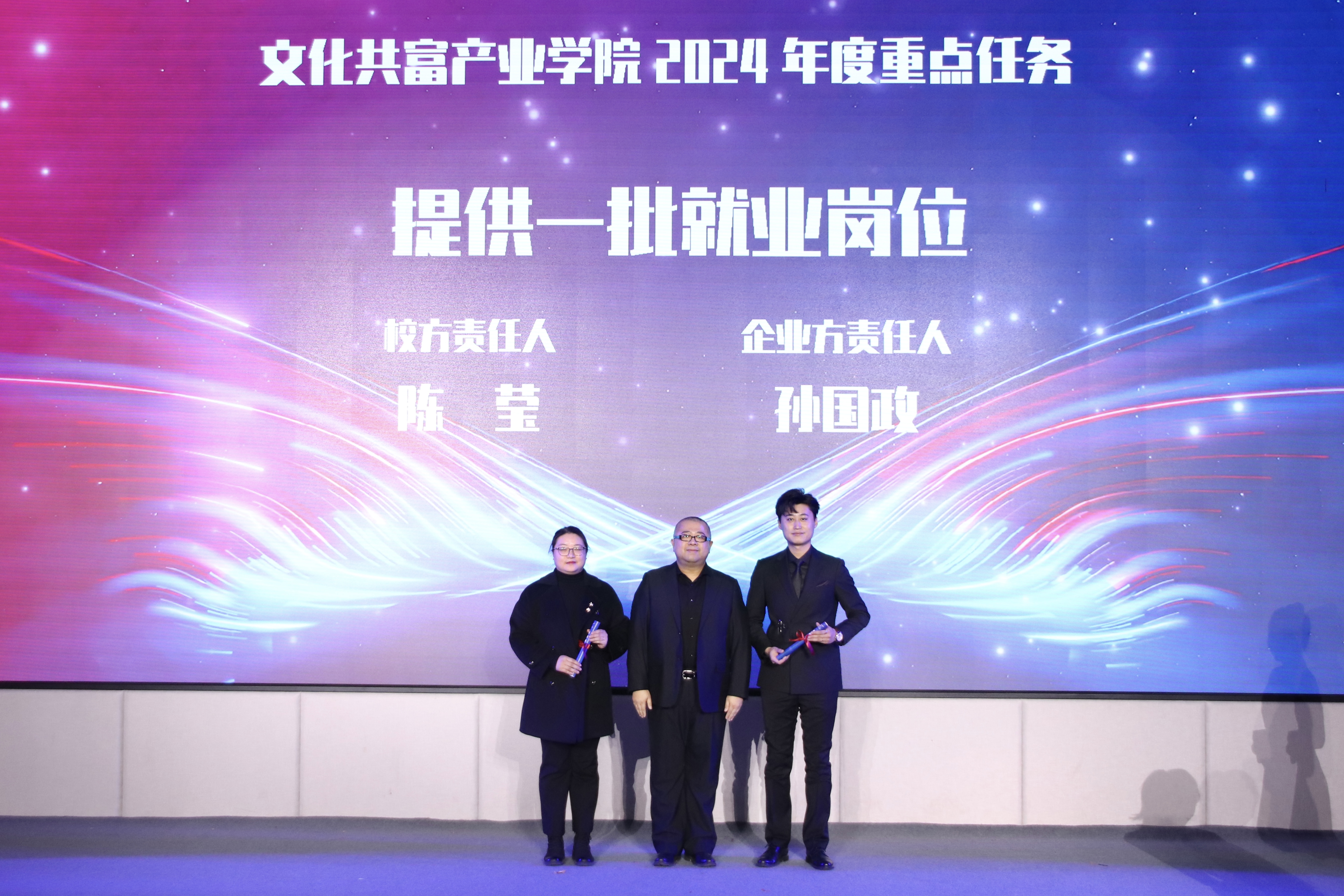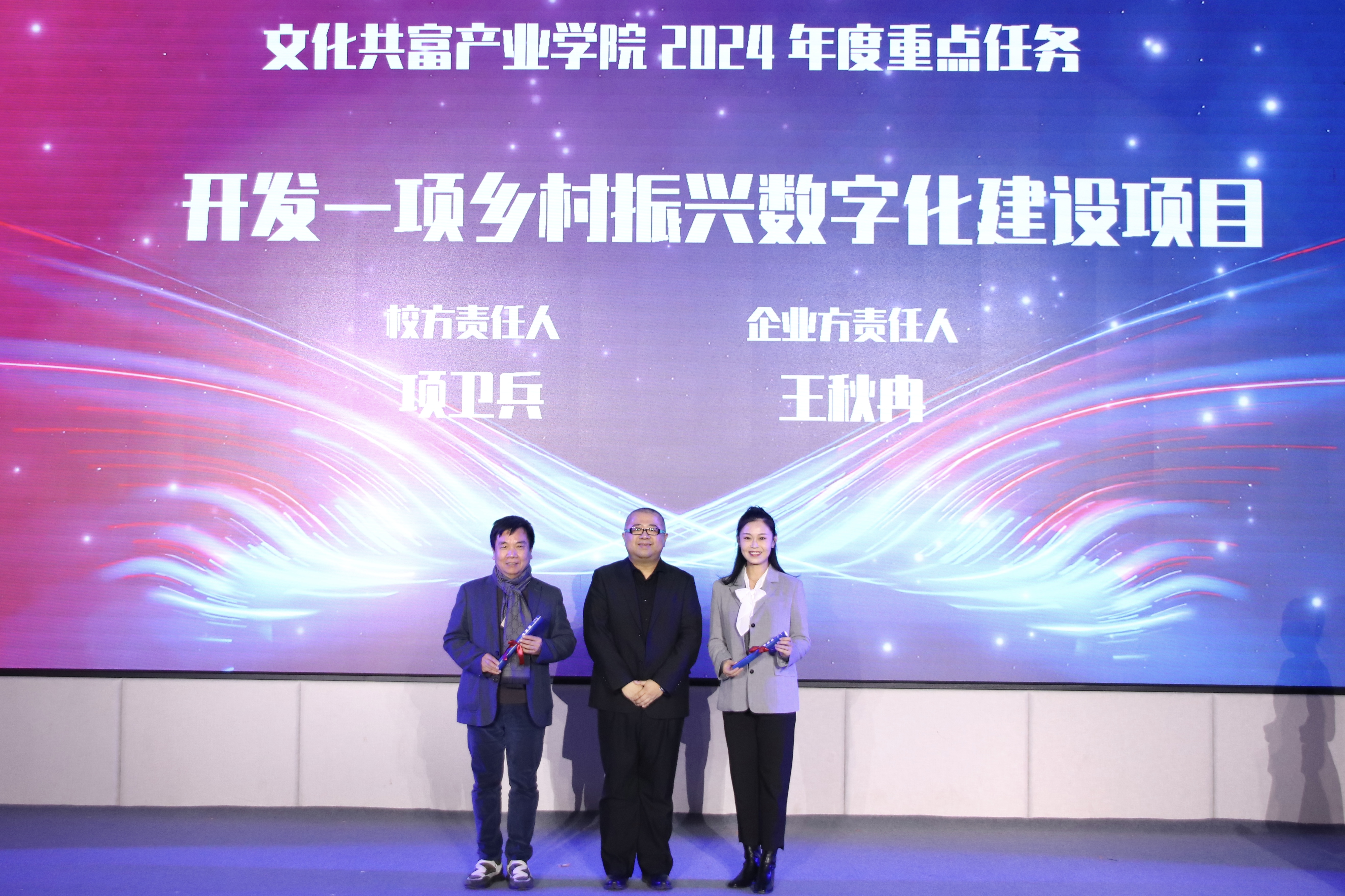 浙江艺术职业学院院长施俊天与杭州新青年歌舞团股份有限公司董事长张钎共同为文化共富产业学院揭牌。现场发布了文化共富产业学院2024年度九大工作任务,校企责任方共同上台领取责任书。