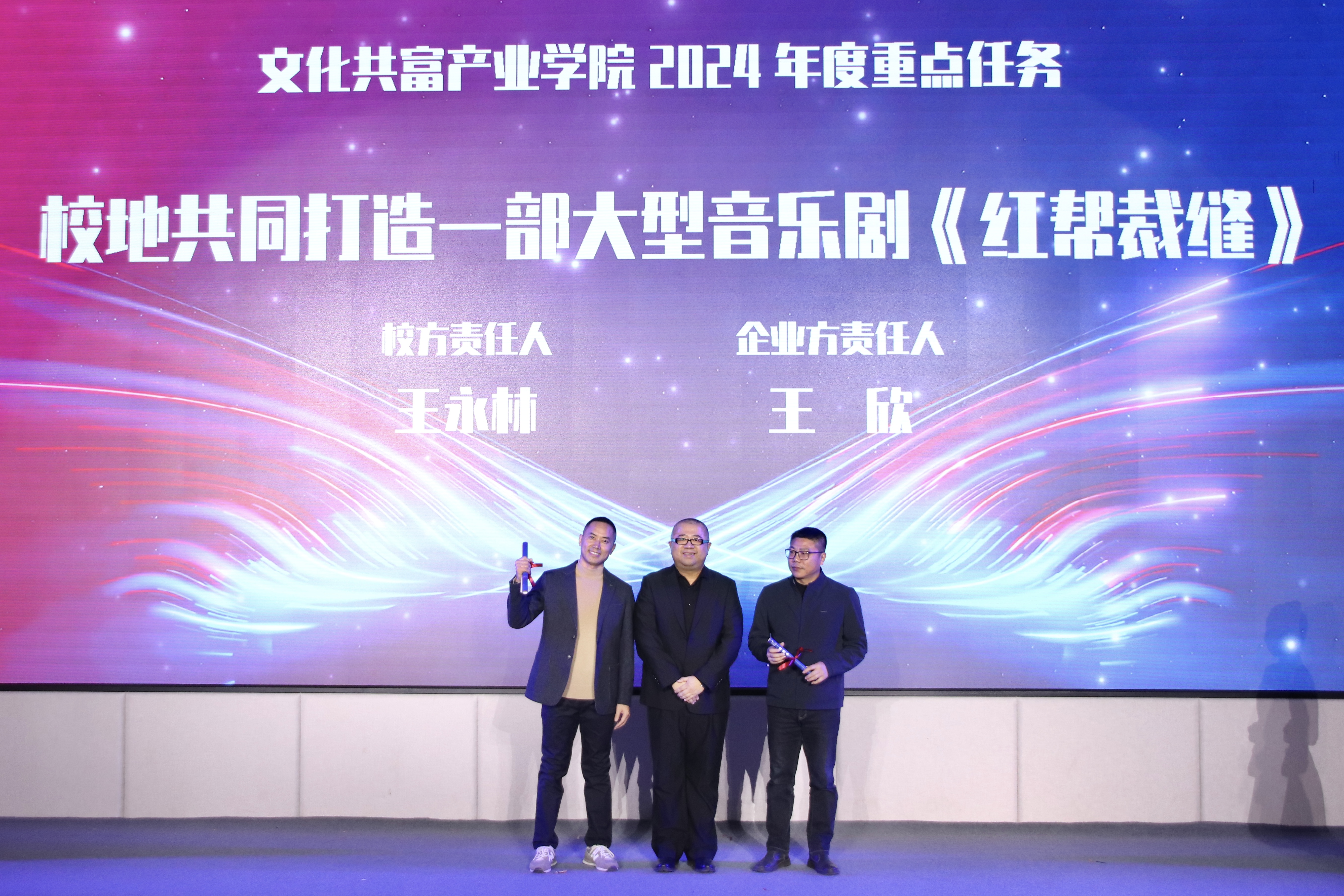 以艺术创作推动文旅融合,以优秀作品引领精神共富,不断深化校地企三方产学研创合作,是文化共富产业学院的重要职能之一。原创大型音乐剧《红帮裁缝》是文化共富产业学院2024年重点工作任务之一,也是浙江省文化和旅游厅的青年领军人才培养项目——“1111”人才计划打造重点项目之一,第二批入选的四位“1111”人才培养对象此次作为主创团队共同加盟打造。现场,厅领导、校领导、合作方领导及项目主创共同为《红帮裁缝》按下启动键。