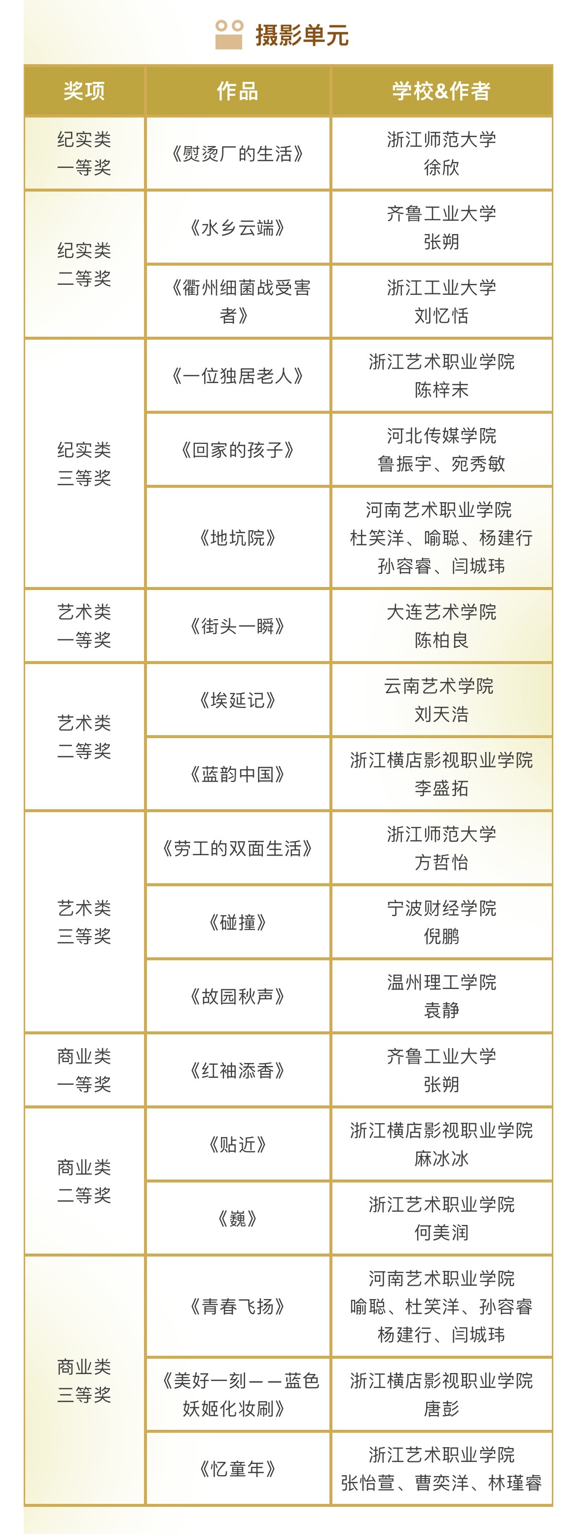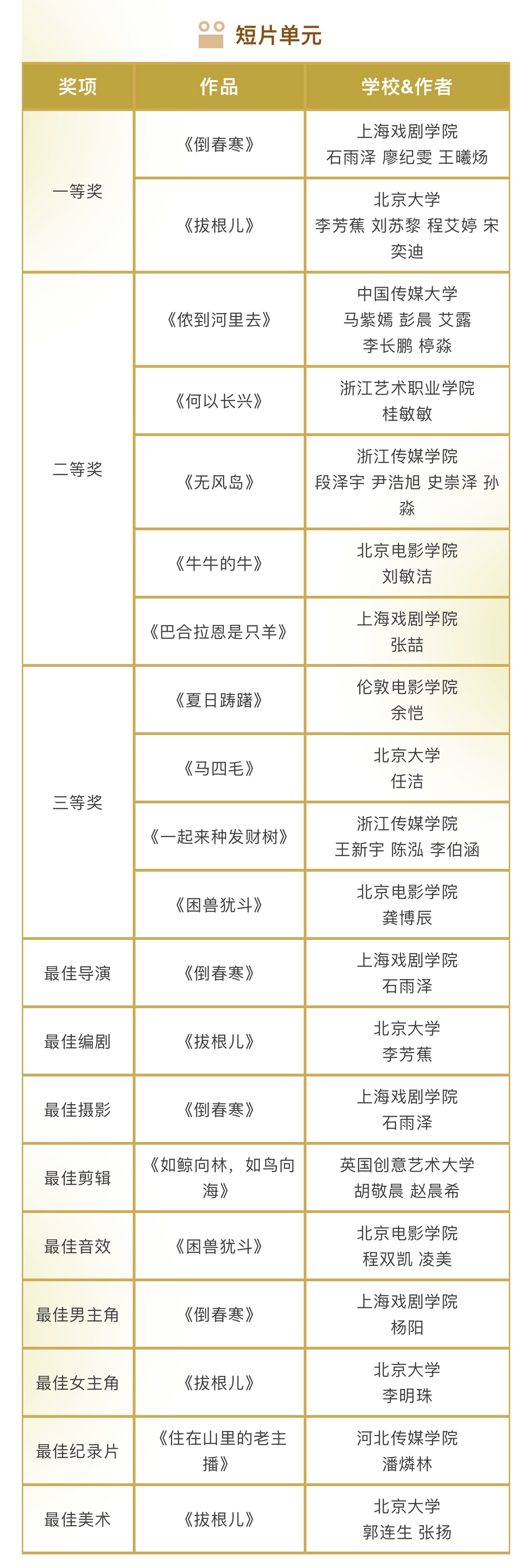 本届金鹄青年电影节共收到来自清华大学、北京电影学院等200所国内外院校的1296件参赛作品,最终有285部作品成功入围。最终,由评委会评选出5个单元的77个奖项以及10个最佳组织单位。具体获奖名单如下: