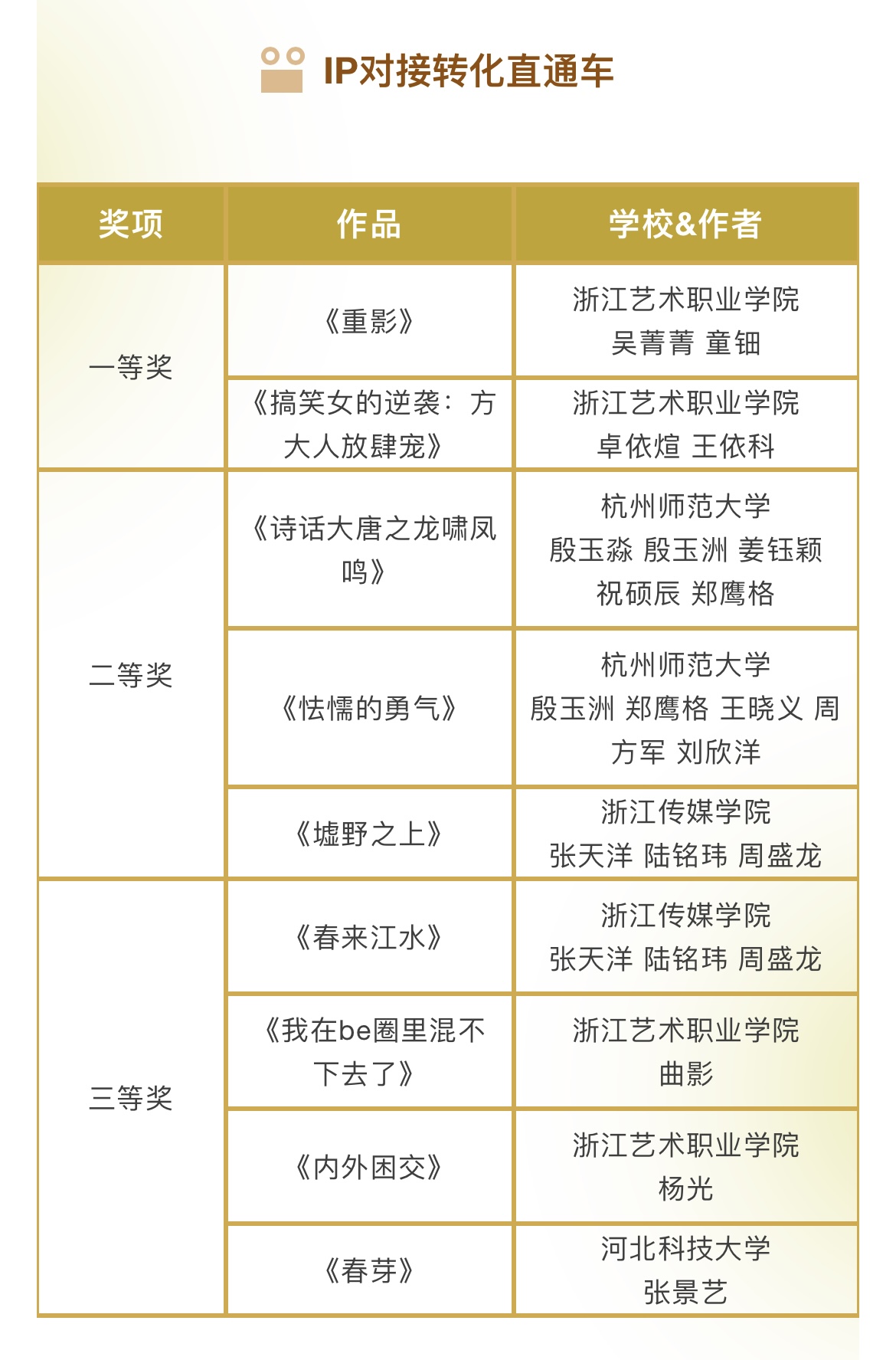 “从光影故事看见诗画江南,用青春力量展示活力浙江。浙江艺术职业学院坚持为中国原创影像新生力量搭建舞台,用青春视角描摩当代中国,连续6年举办金鹄青年电影节,开创了省内高等院校自主举办青年电影节的先河。”薛亮表示,本届金鹄青年电影节,学校与滨江区进一步深化校地协同合作,首次举办“IP对接转化直通车”,促进产教深度融合、成果落实转化,引导电影节优秀团队与项目落地滨江、接轨企业,努力实现“项目在地转化、创意创造效益”。浙江艺术职业学院将继续努力办好金鹄青年电影节,让金鹄成为更多青年电影人梦想开始的地方,为助力浙江文化强省建设、打造新时代文化高地贡献新的力量。