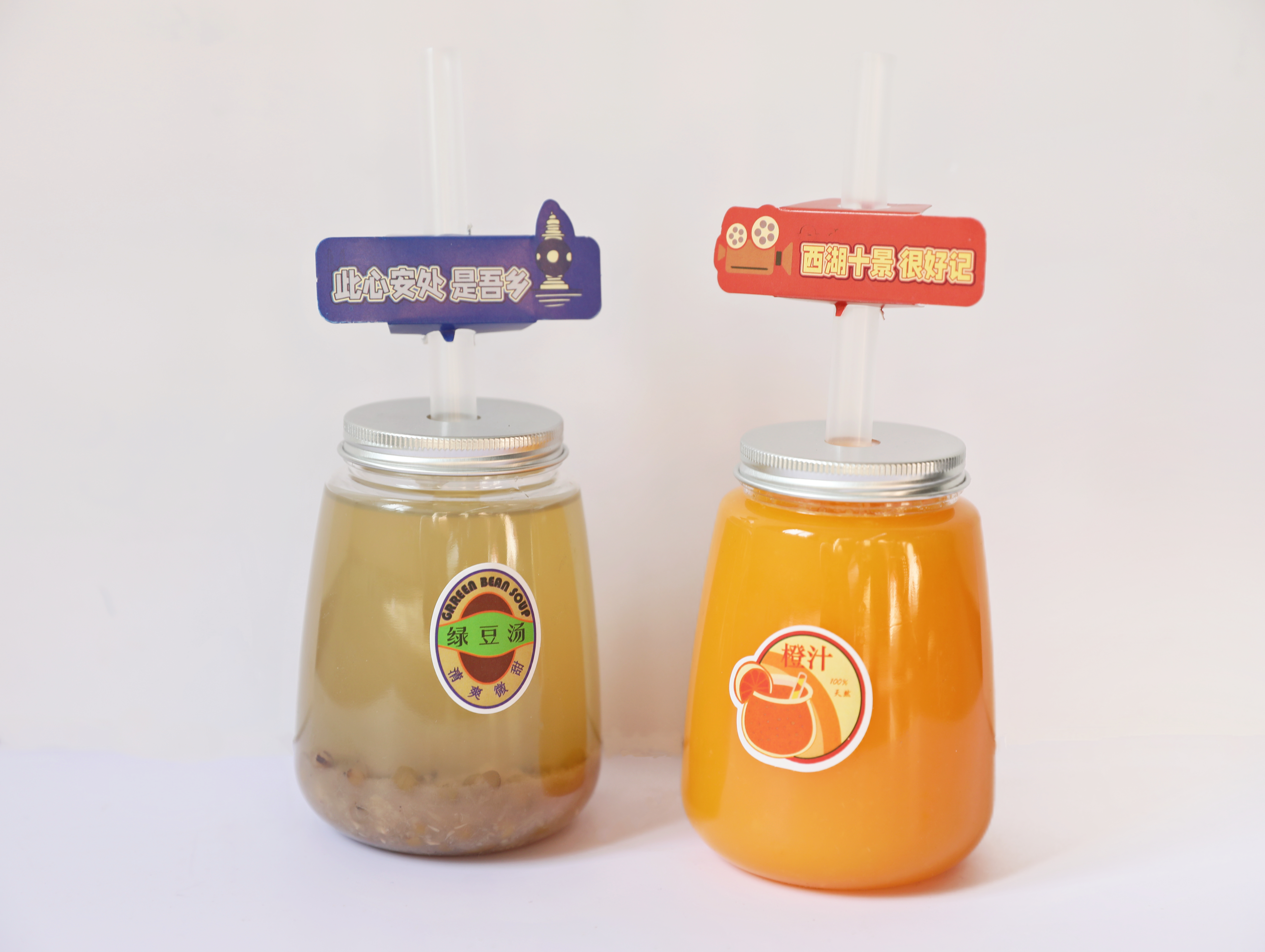 橙汁贴纸以橙子为视觉中心,结合瓶身的形状,转化为异形的形式,运用不同色调的橙、黄色混合,丰富层次感,体现其新鲜多汁。外圈还添加复古绿作为装饰点缀,增添复古感。绿豆汤贴纸以90年代夏日消暑为灵感,主打怀旧童年时光,富有生活化趣味。配色采用复古的红蓝绿为主色,辅以亮橙和浅黄。字体使用简易加粗字体,“绿豆汤”主体位于中间,下方体现绿豆汤“清爽微甜”的特点。