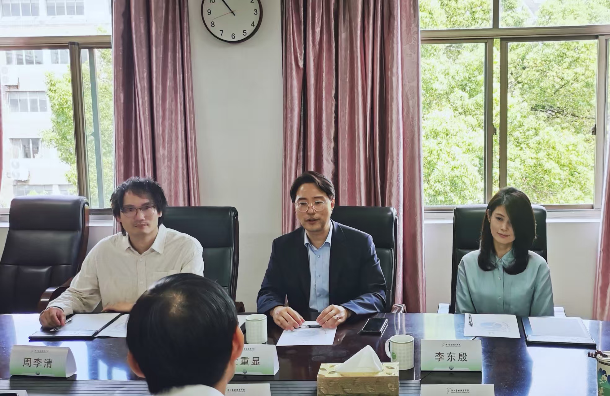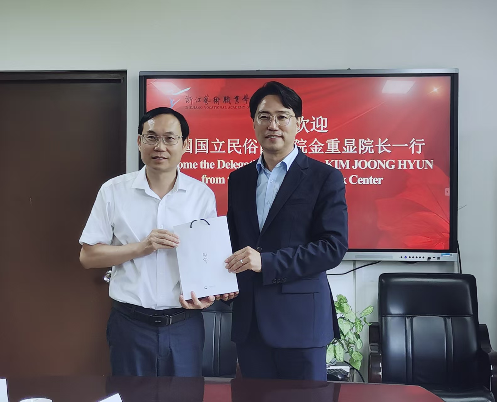 金重显院长对浙江艺术职业学院的专业建设与办学成就表示高度赞赏。他介绍,韩国国立民俗国乐院是韩国国家级民俗文化研究与艺术表演机构,致力于保存、研究与推广韩国传统音乐、舞蹈、民俗等非物质文化遗产,在国际文化交流中扮演重要角色。针对未来合作,他提出三点倡议:一是联合研究,围绕中韩传统音乐、舞蹈、手工艺的比较研究设立专项课题,开展学术研讨会,推动学术成果共享;二是互鉴演出,通过互派艺术团组开展巡演、工作坊等活动,促进两国传统艺术的活态传播;三是协同办学,探索联合培养、短期交换生等项目,共同开发跨文化艺术课程,培养具有国际视野的传统艺术人才。最后,双方互赠礼物。