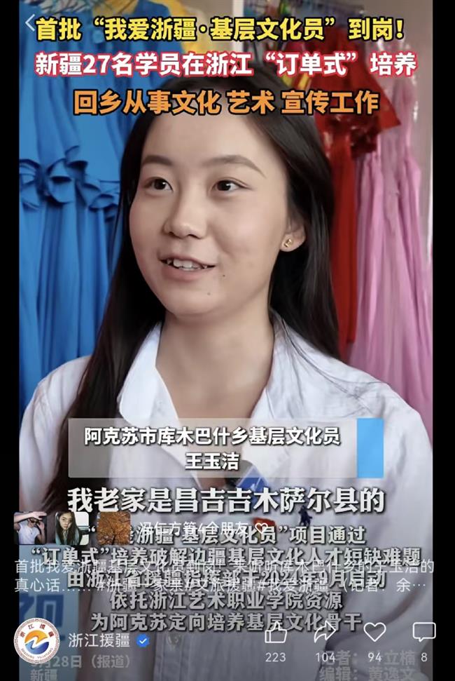 文化润疆,输出“浙江经验”:学院构建“人才培养+文艺创作”双轮驱动模式,与新疆高校联合培养的“我爱浙疆·基层文化员”学员(民族生占比80%)全部顺利完成学业,并与阿克苏地区及兵团第一师10家文旅单位实现就业结对。同期创排的大型文旅演艺情景剧《陈汤迎宾》,以文化赋能助力天山托木尔景区成功创建国家5A级旅游景区,已成为景区核心文旅IP,累计接待游客超20万人次。两大项目协同并进,为浙江文旅援疆输出了可复制、可推广的“文化润疆”实践样本。