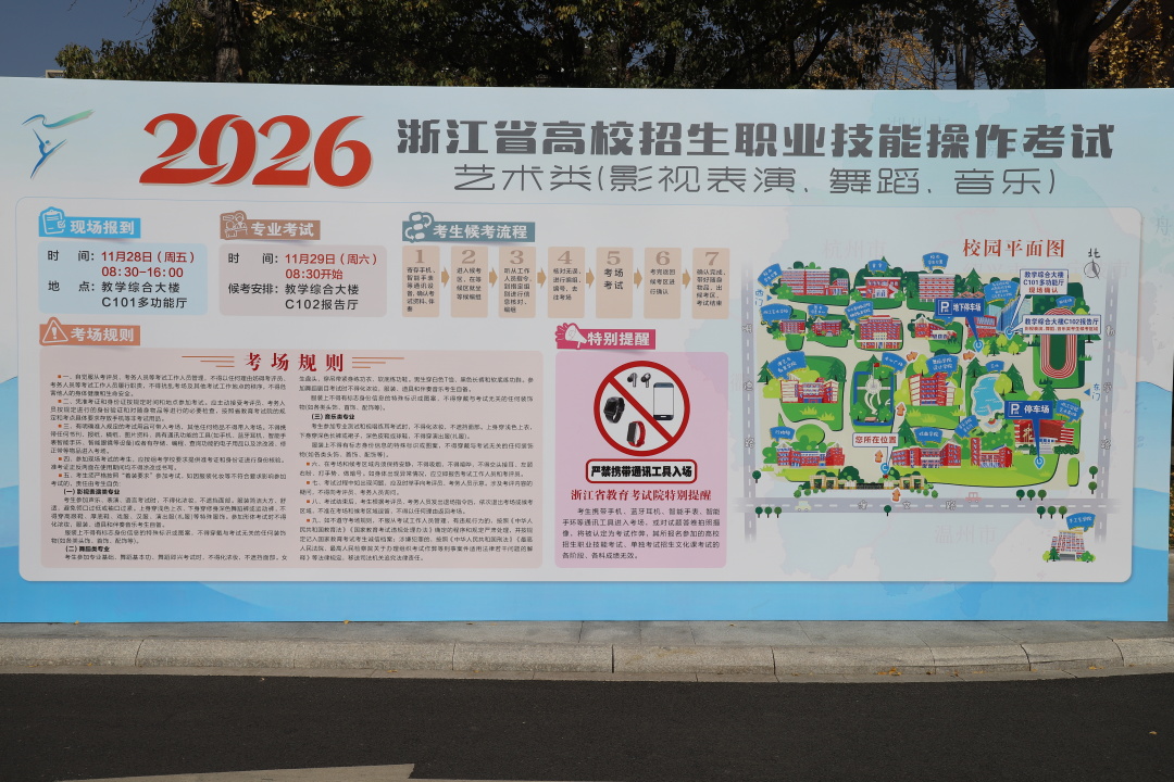 11月29日,1068名考生怀揣着梦想与期待,踏入浙江艺术职业学院的大门。这里正在举行2026年浙江省高校招生职业技能操作考试艺术类(影视表演、舞蹈、音乐)专业考试。