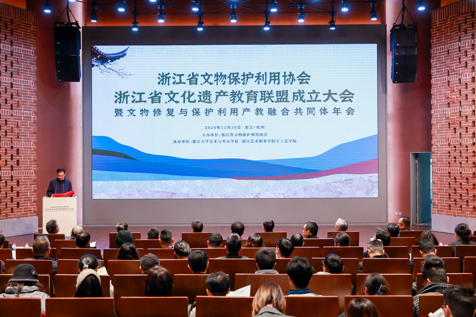 <p style="text-indent:28px"><span style="font-family: 宋体, SimSun;">11月29日,浙江省文化遗产教育联盟成立大会暨文物修复与保护利用产教融合共同体年会在浙江大学西溪校区逸夫科教馆举行。本次会议以“共商、共建、共育、共享”为主题,汇聚行业协会、高校、职业院校、文博机构和科研院近200余名代表,共同推动文化遗产领域产教融合与人才培养体系建设。</span></p>