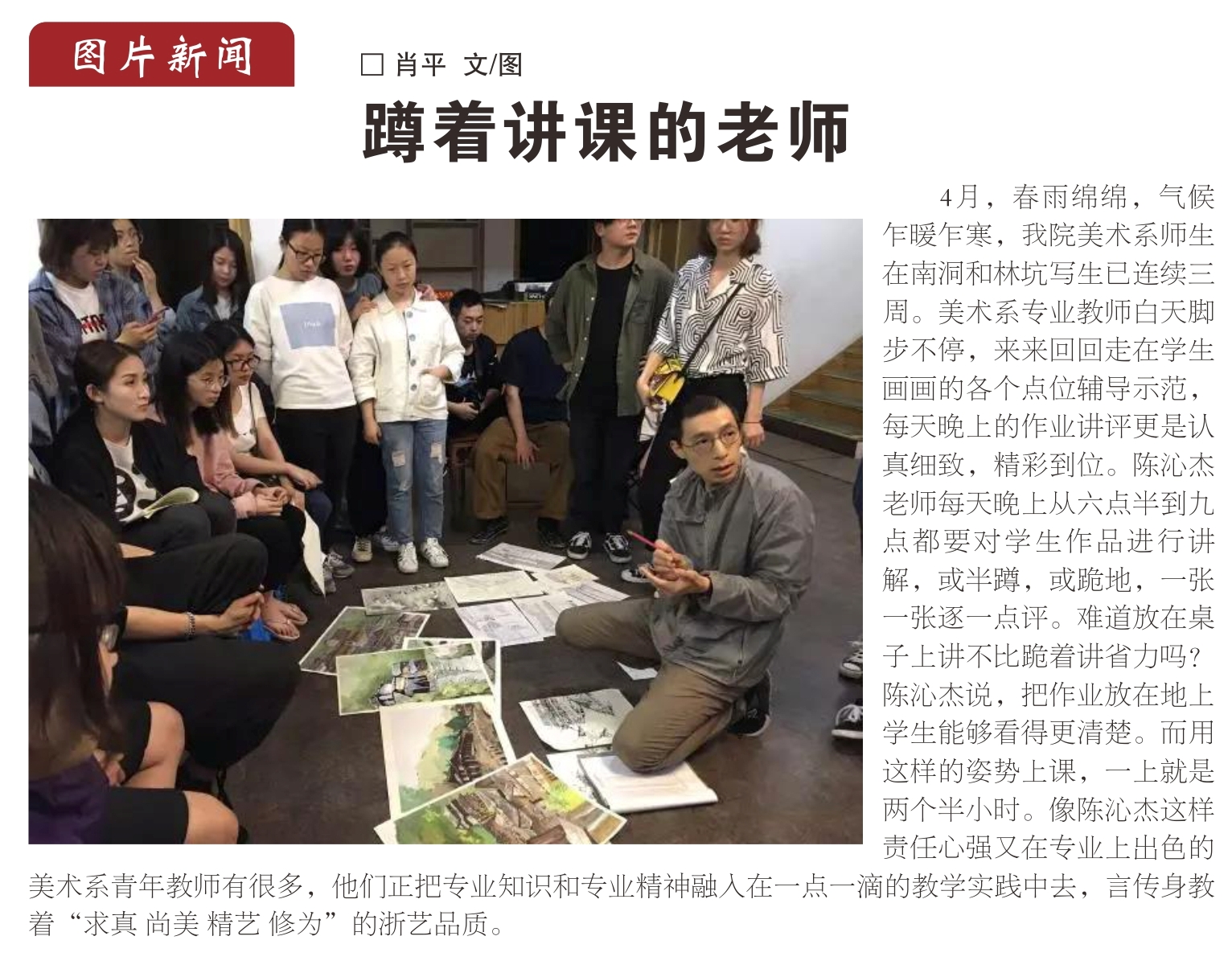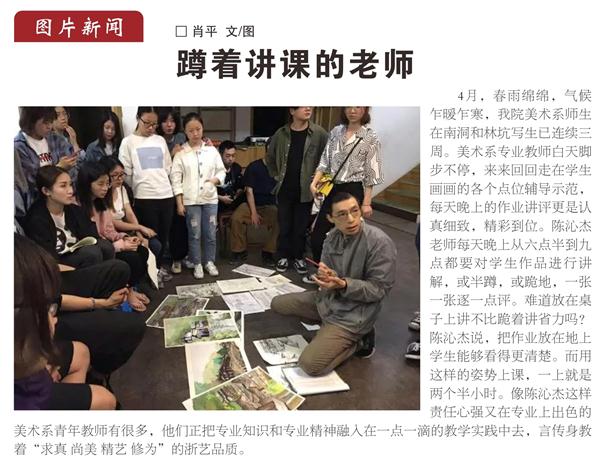 肖平笑言当时拍摄的初衷很简单,一方面是为了给系里存档用,另一方面也想让学校老师们了解美术系师生在外采风写生的一些情况。令她意想不到的是,照片发至学校干部和教师沟通交流的平台“浙艺宣传”微信群后,即引来了校领导和老师们的称赞,大家都为照片中那个蹲着为学生讲解的陈沁杰老师所感动,校报及时邀约肖平为照片配写了简短文字,发表在2017年4月30日第6期《浙江艺术职业学院报》二版。
