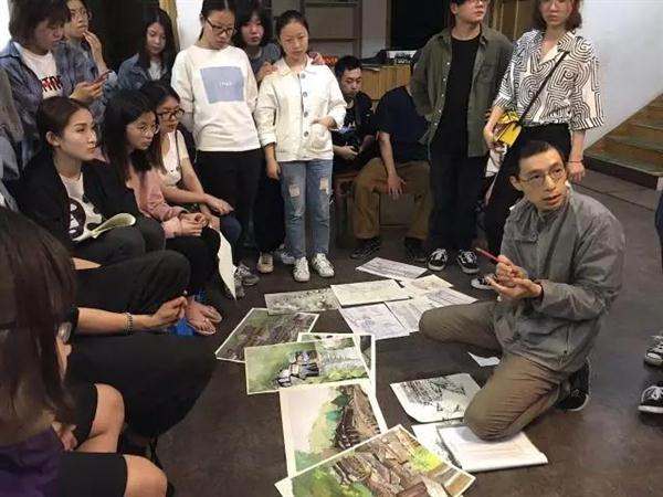 时间回到2017年4月。当时肖平担任美术系组织员,负责带领学生一年两次外出开展采风写生活动。那次,美术系师生在浙南温州的南洞和林坑写生已连续三周。老师们白天脚步不停,来来回回地走在学生写生的各个点位辅导示范,每天晚上的作业讲评更是认真细致。青年美术教师陈沁杰每晚都要对当日的学生作品进行讲解,因为桌子小,他担心20多个学生围着会看不见,便索性半蹲在地上,一张一张地逐一点评,时间久了,干脆跪着为学生讲解。这样的情形也许一次两次无所谓,但是肖平经常见到陈老师用这样的方式为学生上课,每晚都是从6点半持续到9点左右。采风写生的周期通常是持续两到三周时间,陈沁杰每晚长时间不辞辛劳地蹲着为学生上课的举动深深感动了在一旁观看的肖平。有一天晚上,她拿起相机默默拍下了这每晚都会上演的感人一幕,温暖的瞬间被定格了。